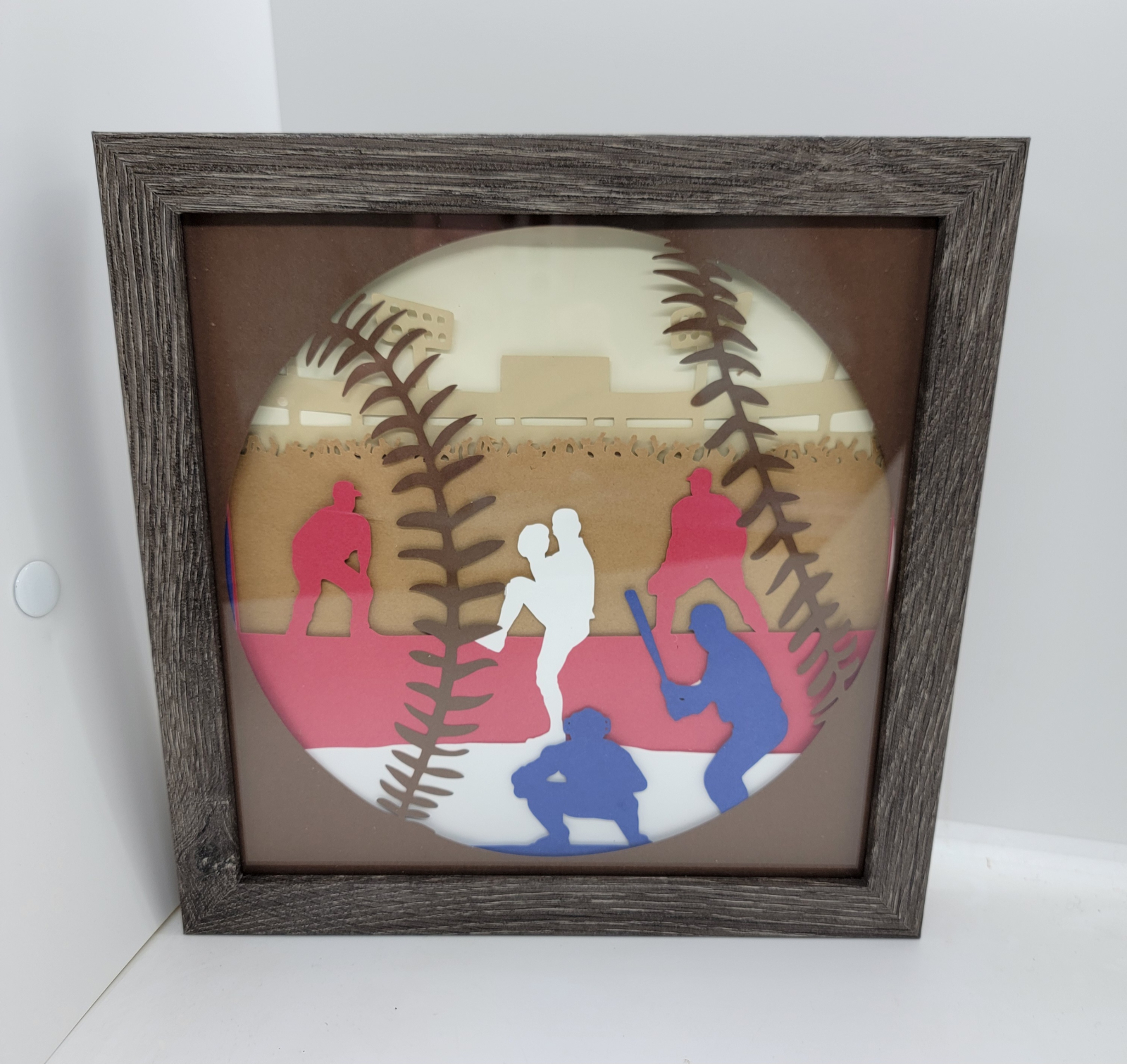 Layered cardstock art uses several layers to create a 3D effect framed 8 by 8. Wrapped in bubble wrap for shipping. Ready to hang or can sit in an easel on a table. (Easel not included)