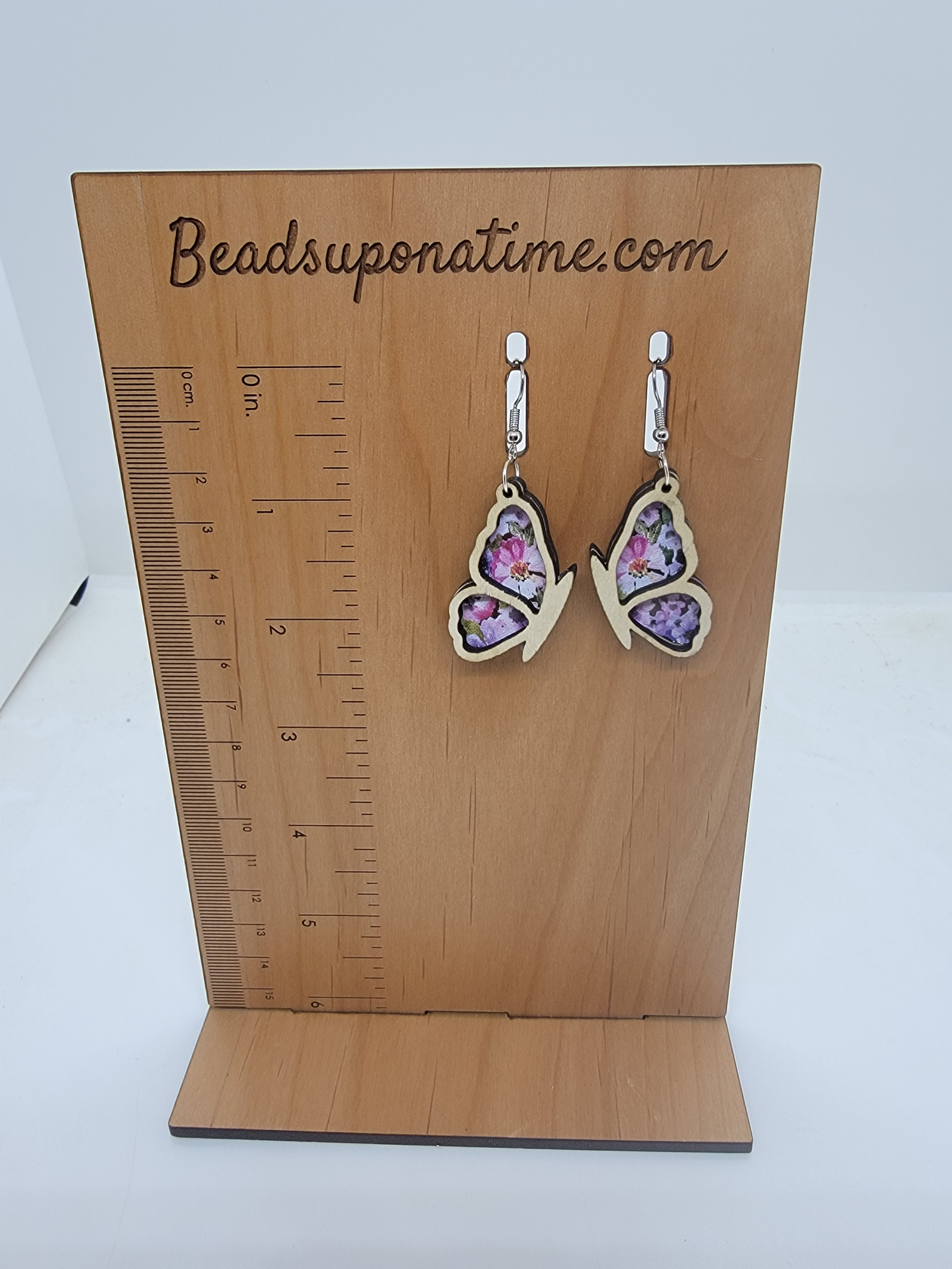 Butterfly dangle earrings cut from birch wood, lightweight. 2 sided design with patterned acrylic in between. See picture for earring length.
