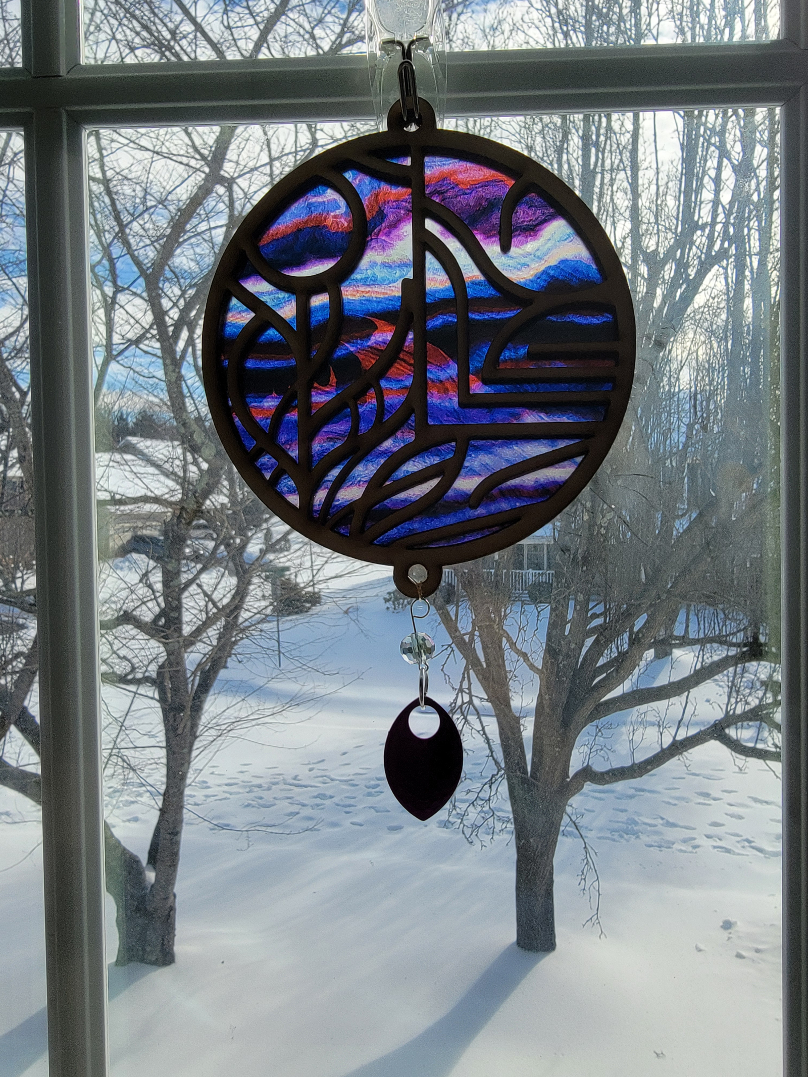 Baltic Birch wooden abstract 2 sided design with green patterned acrylic in between. Top coat finish applied to wood and a purple hammered metal bead attached. Bubble wrapped for shipping.